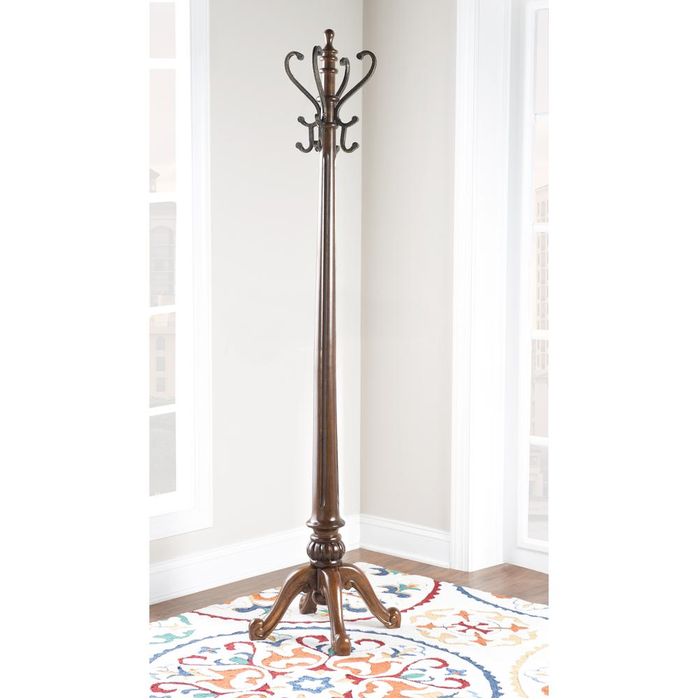 Provides style and function to any room. Features antique brass textured hooks to hang your coats and hats. Queen Anne styled legs feature detailed carvings. Warm Nut Brown Finish Some Assembly Required